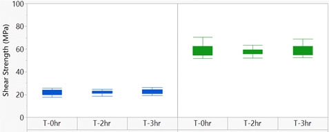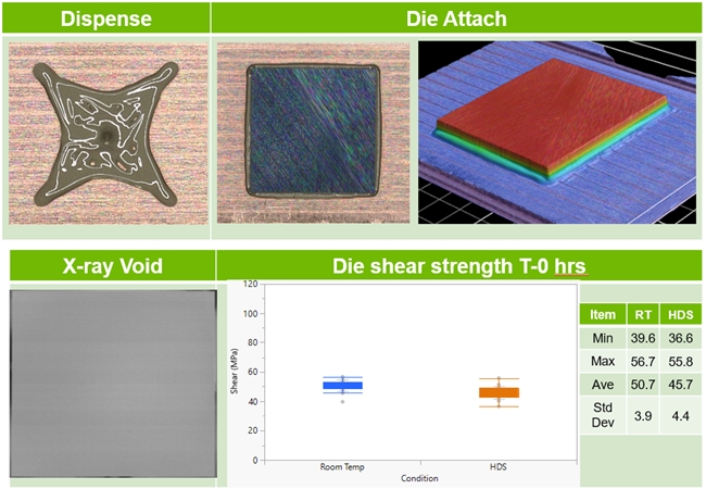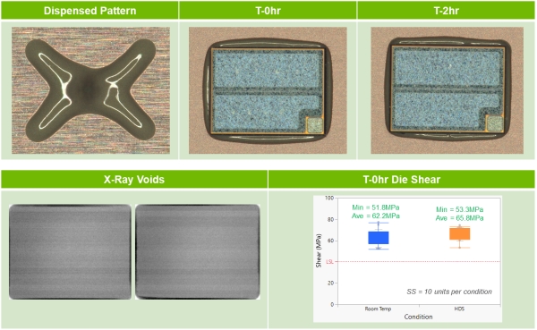 2)open-time(画完胶到贴装芯片的等待时间)可以达到2个小时,即在Time 0 和time 2小时贴装均可以到达100%银膏覆盖。