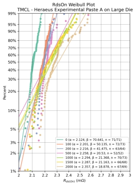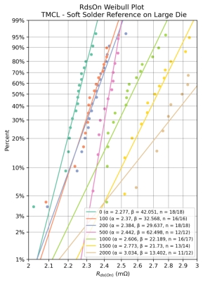 结论:如图7所示,高铅焊料在500至1000次循环之间平均导通电阻出现显著的变化;在1500次循环测量中观察到平均